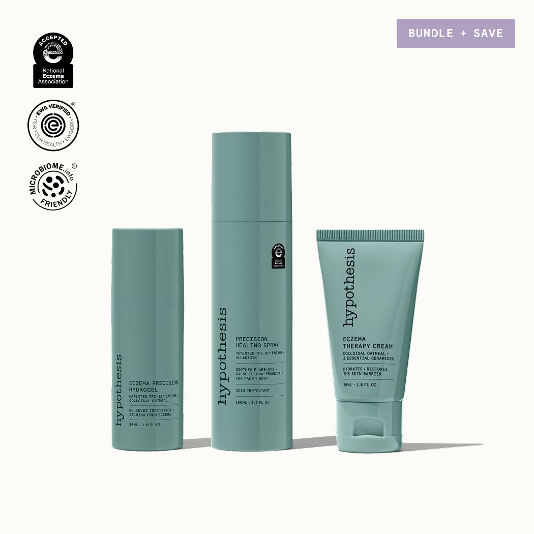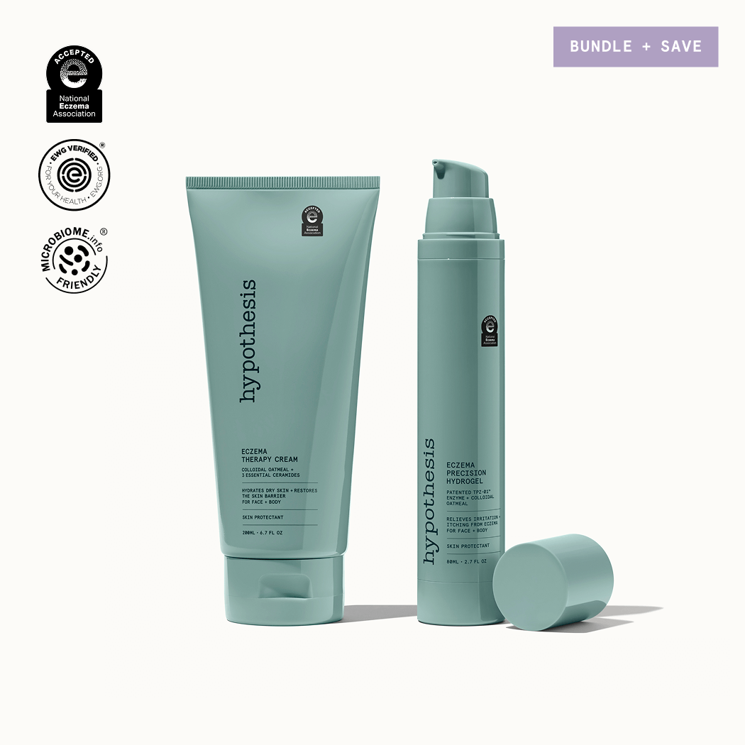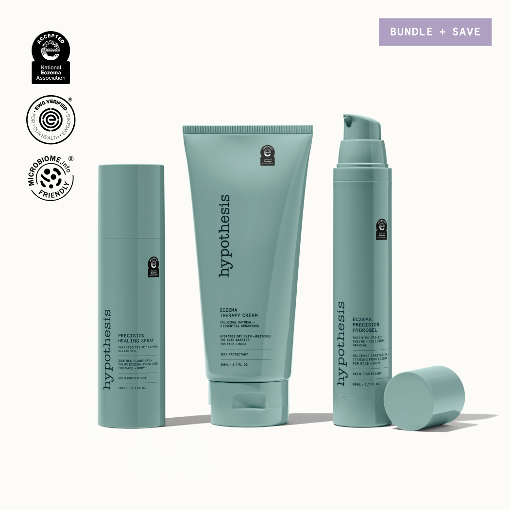 At Hypothesis, we’re using biotechnology to develop clinically validated skincare that tackles the eczema microbiome head on. Our patented TPZ-01™ precision enzyme targets and kills eczema-associated Staph aureus bacteria while preserving the rest of your skin’s helpful microbiome, helping to reestablish a healthy, balanced microbiome that breaks the cycle of itching, skin barrier damage, and flare-ups.
